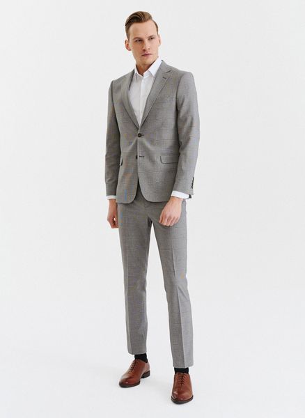 Męskie spodnie garniturowe w kratę w brązowych tonach. Brązowe spodnie formalne. Spodnie w kant. Brązowy garnitur. Slim. Skład poliester, wiskoza, elastan.