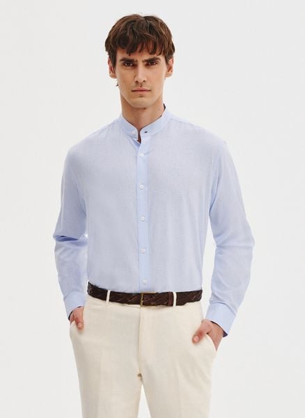 Niebieska koszula męska – Pako Lorente. Lniana koszula męska z długim rękawem. Fason: Regular. Skład: 55% len, 45% bawełna. Gładka jasna koszula lniana na wiosnę. Koszula ze stójką.