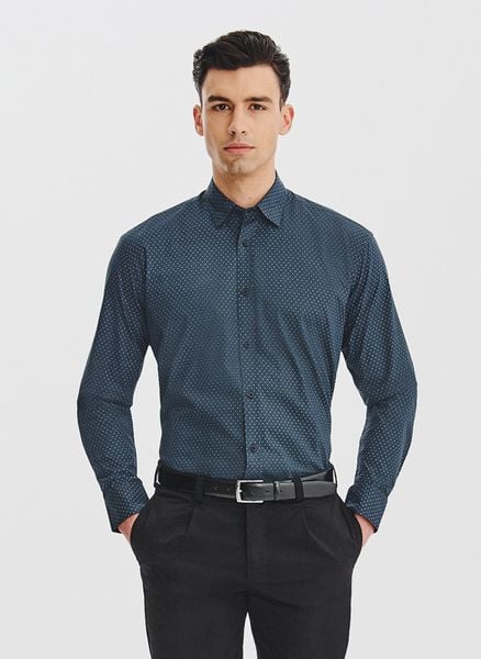 Koszula męska wzór geometryczny – Pako Lorente. Ciemna koszula na długi rękaw. Koszula w drobny wzór geometryczny. Skład: 100% bawełna. Koszula Regular. Jesienna koszula męska.