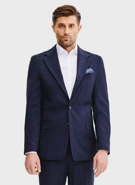 Wełniana marynarka garniturowa męska – Pako Lorente. Gładka granatowa marynarka. Fason: Slim. Skład: 100% wełna. Marynarka garniturowa. Marynarka biznesowa. Jednorzędowa marynarka. Premium.