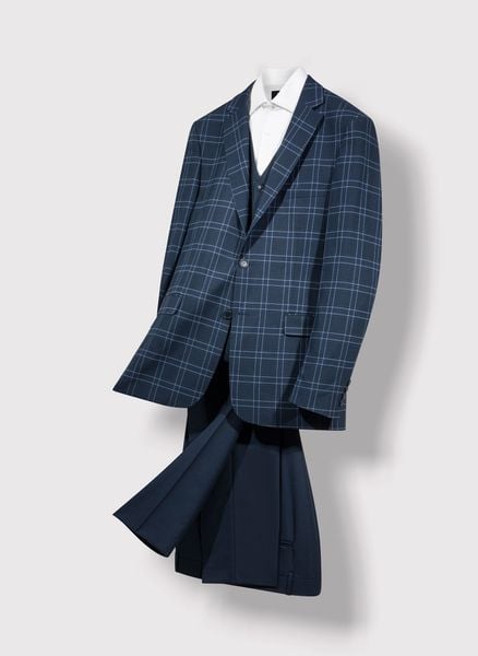 Granatowa marynarka garniturowa – Pako Lorente. Marynarka męska w kolorze granatowym w kratę. Marynarka na formalne okazje. Skład: poliester, wiskoza, elastan