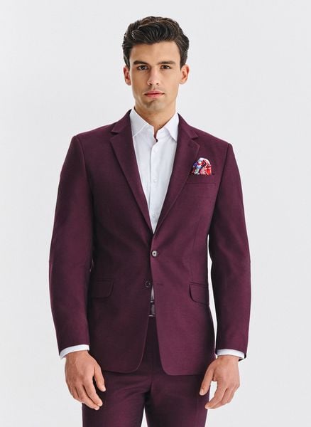 Bordowa marynarka garniturowa – Pako Lorente. Bordowa marynarka męska. Marynarka jednorzędowa. Marynarka dla Pana Młodego. Fason: Slim. Skład: 75% poliester, 22% wiskoza, 3% elastan.