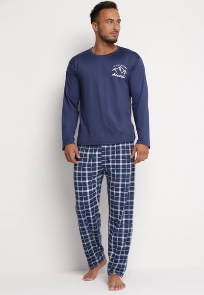 Granatowa Piżama 2-Częściowy Komplet z Długim Rękawem i Nadrukiem oraz Spodniami z Gumką w Pasie Junco